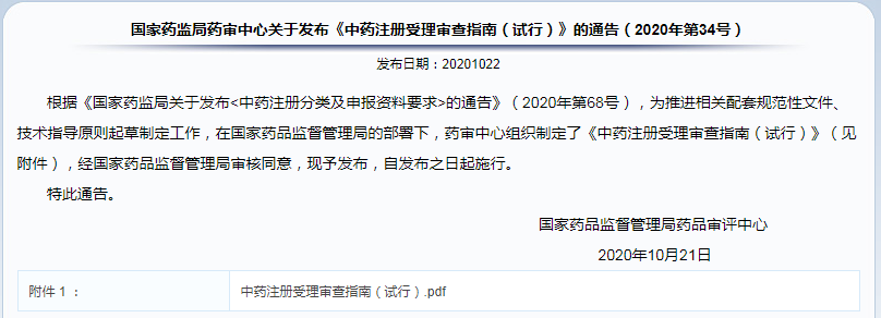 ?  國(guó)家藥監(jiān)局藥審中心關(guān)于發(fā)布《中藥注冊(cè)受理審查指南(試行)》的通告(2020年第34號(hào))