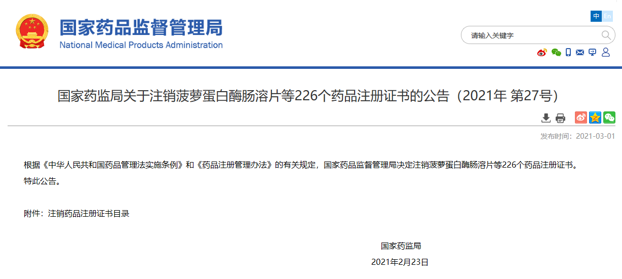 國家藥監(jiān)局關(guān)于注銷菠蘿蛋白酶腸溶片等226個藥品注冊證書的公告(2021年 第27號)