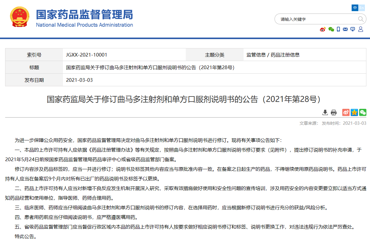 關(guān)于修訂曲馬多注射劑和單方口服劑說明書的公告(2021年第28號)