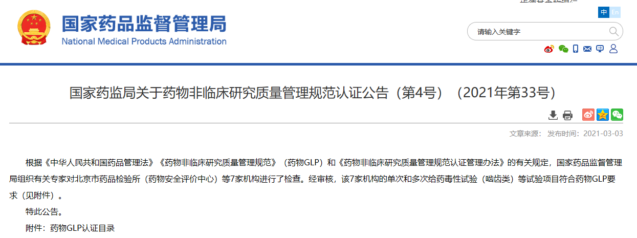 關(guān)于藥物非臨床研究質(zhì)量管理規(guī)范認(rèn)證公告(第4號)(2021年第33號)