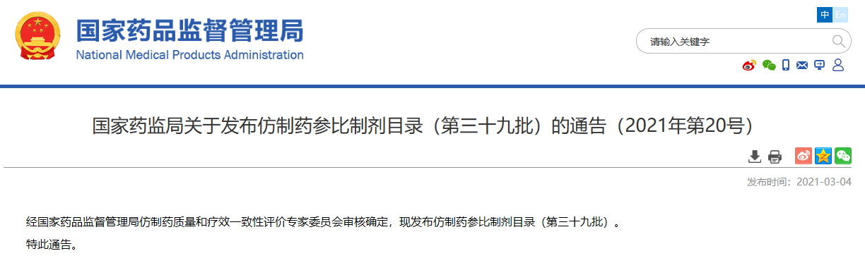 關(guān)于發(fā)布仿制藥參比制劑目錄(第三十九批)的通告(2021年第20號