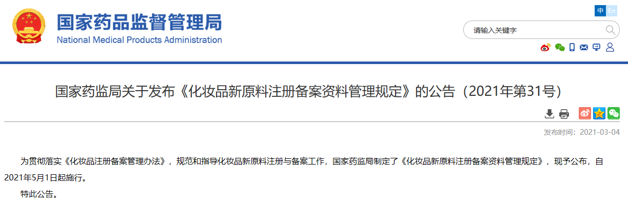 發(fā)布《化妝品新原料注冊備案資料管理規(guī)定》的公告(2021年第31號)