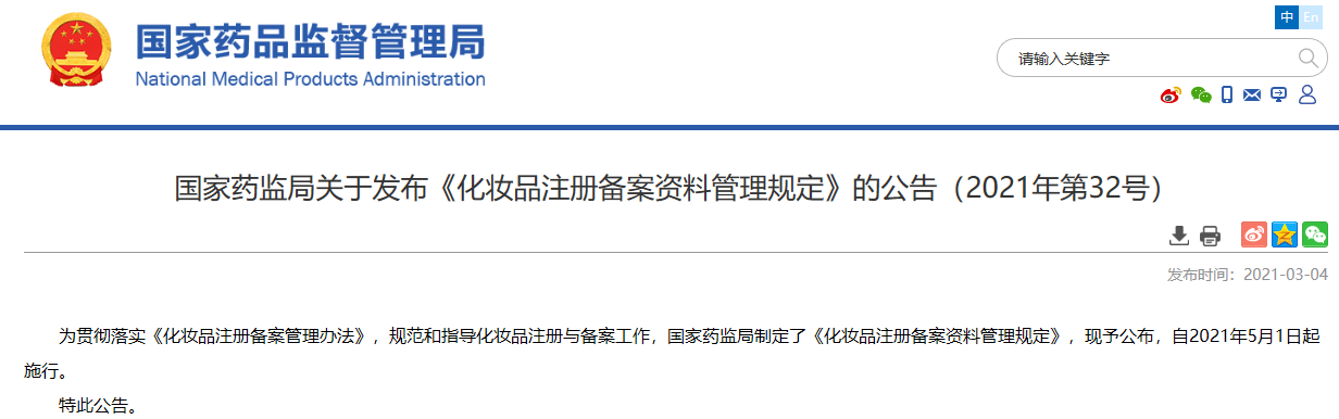 關(guān)于發(fā)布《化妝品注冊備案資料管理規(guī)定》的公告(2021年第32號)