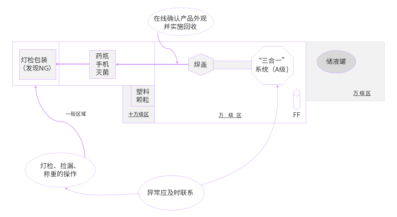 通過(guò)以上介紹表明,BFS技術(shù)在無(wú)菌保證方面總體上比傳統(tǒng)洗灌封工藝優(yōu)勢(shì)明顯,為了保障整個(gè)生產(chǎn)工藝的無(wú)菌水平,還需要與BFS生產(chǎn)線配套的重要設(shè)施和設(shè)備,BFS生產(chǎn)流程示意圖如下: