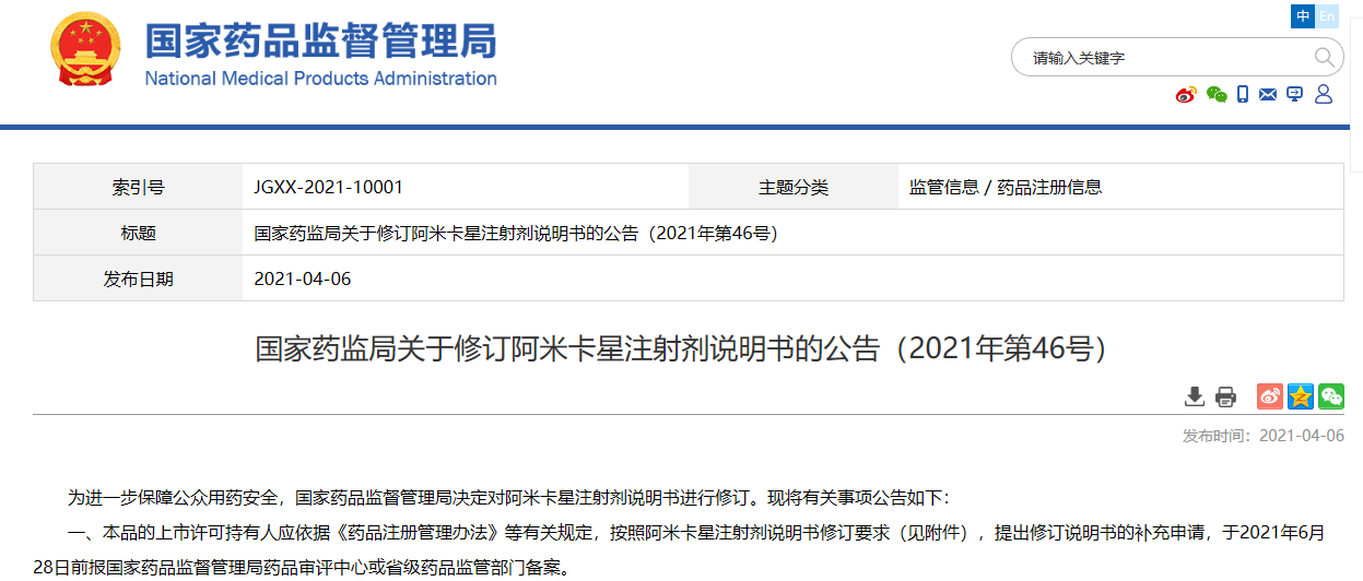 國(guó)家藥監(jiān)局關(guān)于修訂阿米卡星注射劑說(shuō)明書(shū)的公告(2021年第46號(hào))