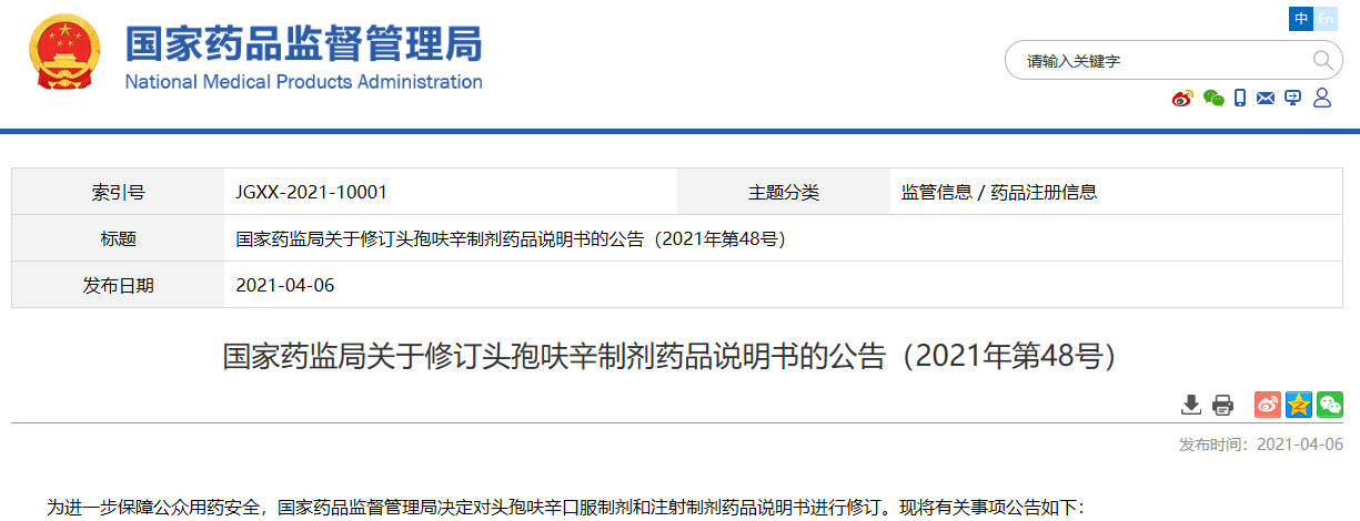 國(guó)家藥監(jiān)局關(guān)于修訂頭孢呋辛制劑藥品說(shuō)明書(shū)的公告(2021年第48號(hào))