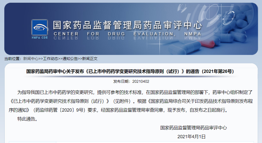 國(guó)家藥監(jiān)局藥審中心關(guān)于發(fā)布《已上市中藥藥學(xué)變更研究技術(shù)指導(dǎo)原則(試行)》的通告(2021年第26號(hào))