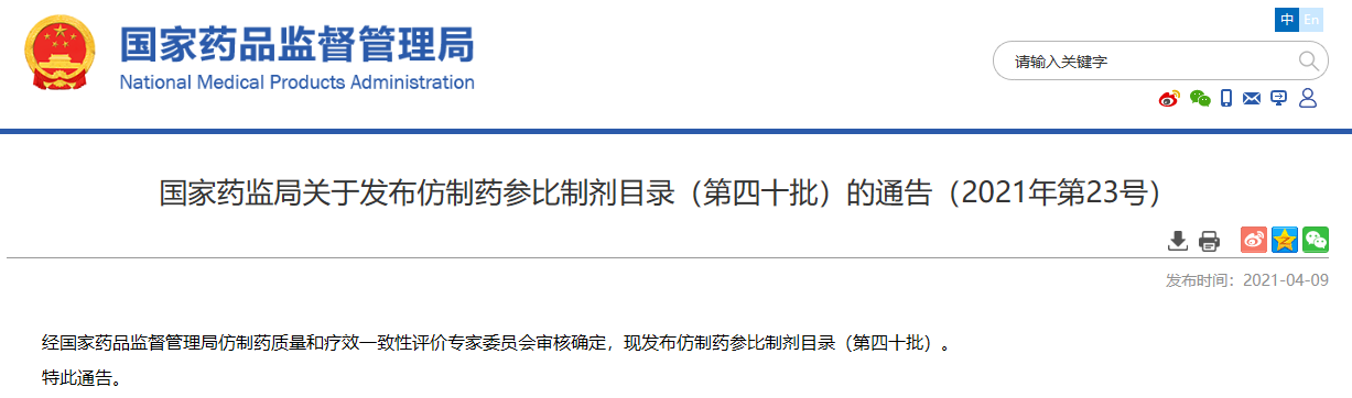 國(guó)家藥監(jiān)局關(guān)于發(fā)布仿制藥參比制劑目錄(第四十批)的通告(2021年第23號(hào))