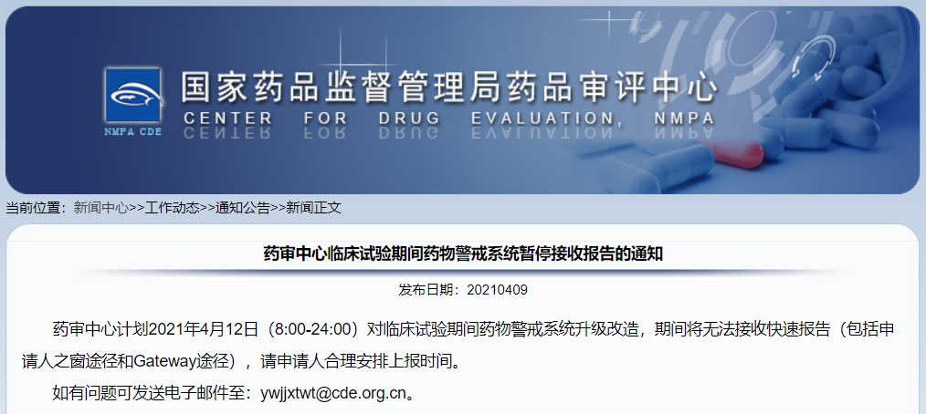 藥審中心臨床試驗(yàn)期間藥物警戒系統(tǒng)暫停接收?qǐng)?bào)告的通知