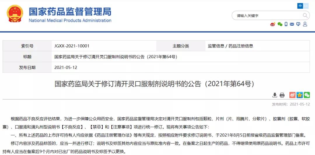 國家藥監(jiān)局關于修訂清開靈口服制劑說明書的公告(2021年第64號)