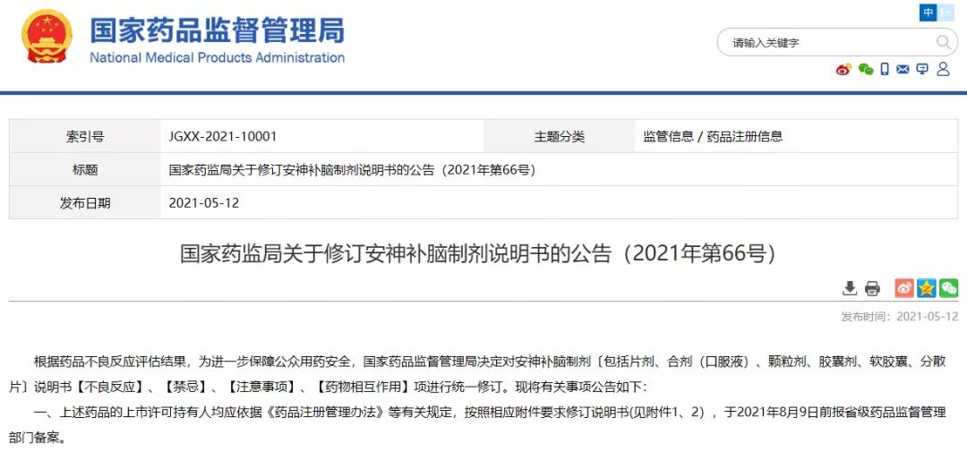 國家藥監(jiān)局關于修訂安神補腦制劑說明書的公告(2021年第66號)
