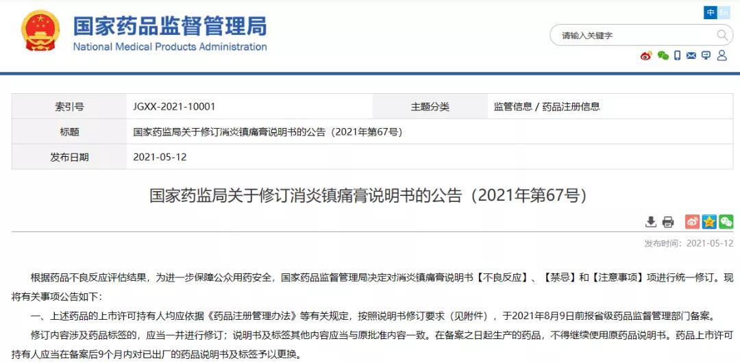 國家藥監(jiān)局關于修訂消炎鎮(zhèn)痛膏說明書的公告(2021年第67號)