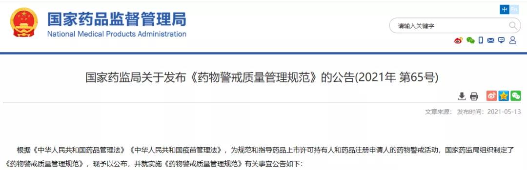 國家藥監(jiān)局關于發(fā)布《藥物警戒質(zhì)量管理規(guī)范》的公告(2021年 第65號)