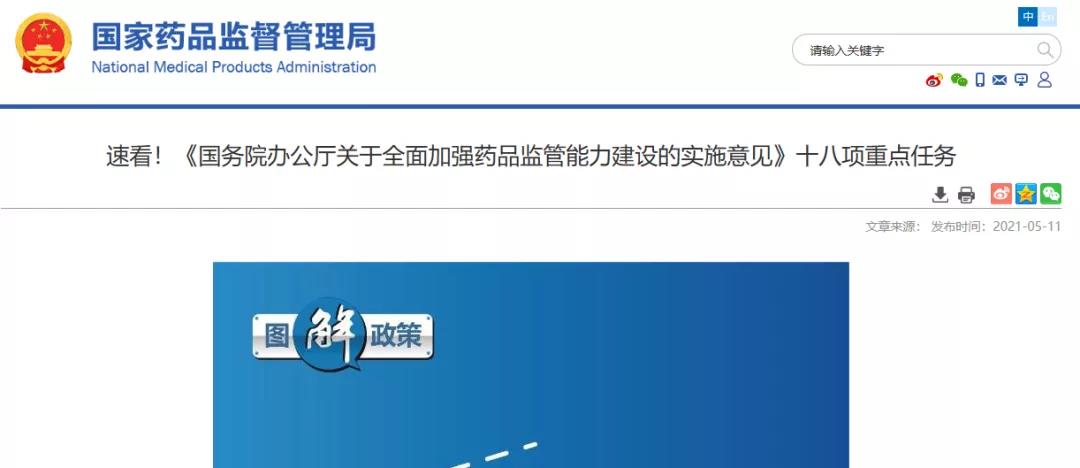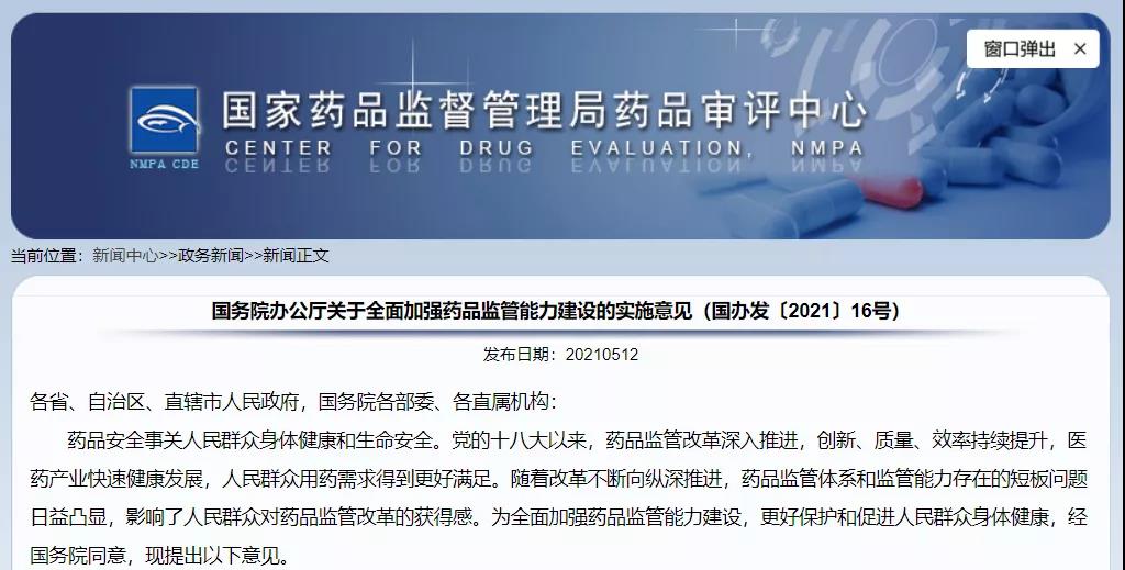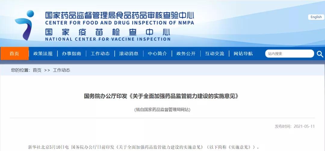 國務院辦公廳關于全面加強藥品監(jiān)管能力建設的實施意見(國辦發(fā)〔2021〕16號)