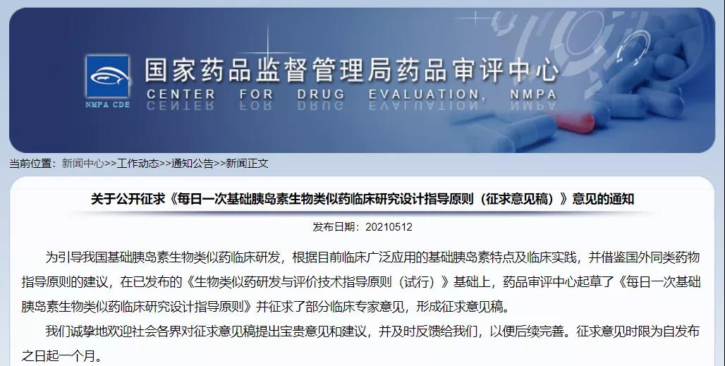 關于公開征求《每日一次基礎胰島素生物類似藥臨床研究設計指導原則(征求意見稿)》意見的通知