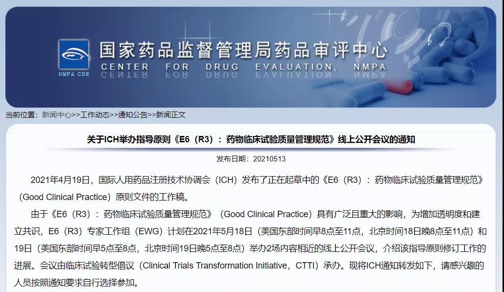 關于ICH舉辦指導原則《E6(R3):藥物臨床試驗質(zhì)量管理規(guī)范》線上公開會議的通知
