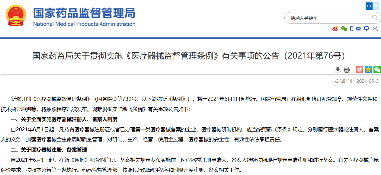 國家藥監(jiān)局關(guān)于貫徹實施《醫(yī)療器械監(jiān)督管理條例》有關(guān)事項的公告(2021年第76號)