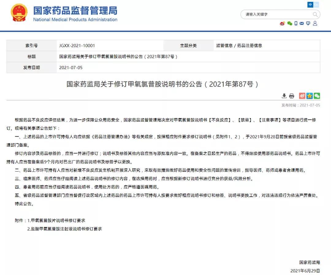 國家藥監(jiān)局關(guān)于修訂甲氧氯普胺說明書的公告(2021年第87號) (2021-07-05)