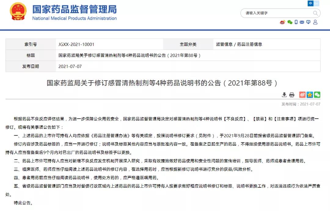 國家藥監(jiān)局關(guān)于修訂感冒清熱制劑等4種藥品說明書的公告(2021年第88號) (2021-07-07)