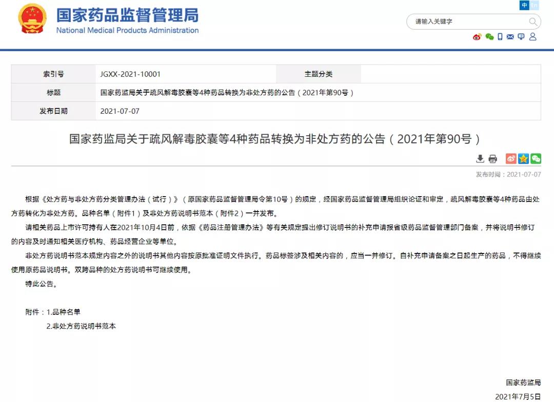 國家藥監(jiān)局關(guān)于疏風解毒膠囊等4種藥品轉(zhuǎn)換為非處方藥的公告(2021年第90號) (2021-07-07)