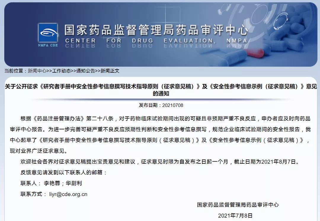 關(guān)于公開征求《研究者手冊中安全性參考信息撰寫技術(shù)指導原則(征求意見稿)》及《安全性參考信息示例(征求意見稿)》意見的通知
