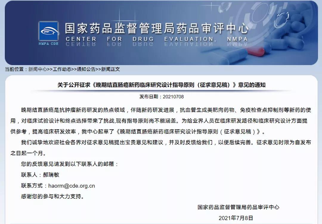 關(guān)于公開征求《晚期結(jié)直腸癌新藥臨床研究設(shè)計指導原則(征求意見稿)》意見的通知