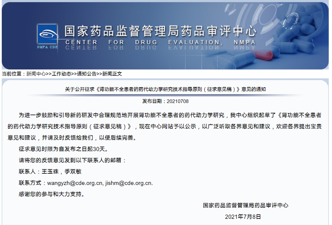 關(guān)于公開征求《腎功能不全患者的藥代動力學研究技術(shù)指導原則(征求意見稿)》意見的通知