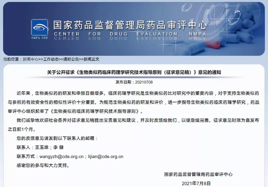 關(guān)于公開征求《生物類似藥臨床藥理學研究技術(shù)指導原則(征求意見稿)》意見的通知