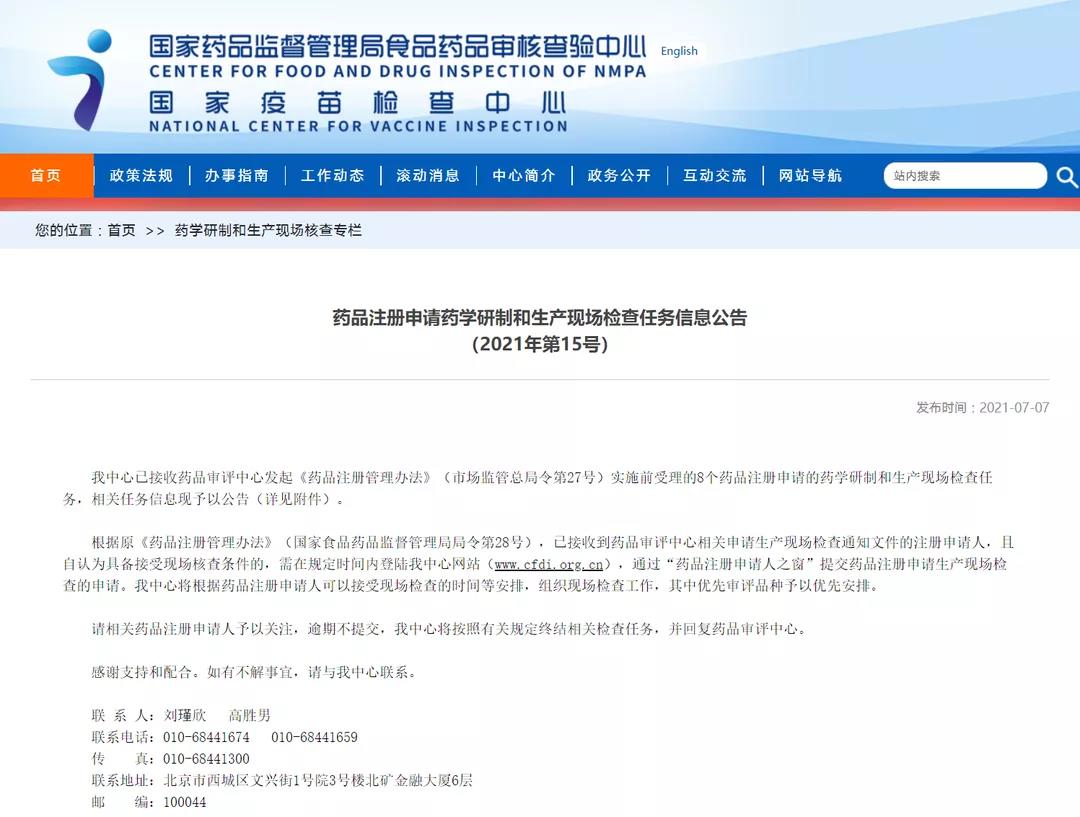 藥品注冊申請藥學研制和生產(chǎn)現(xiàn)場檢查任務(wù)信息公告(2021年第15號)