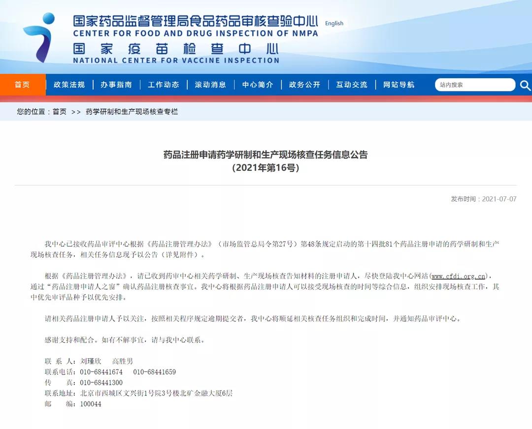 藥品注冊申請藥學研制和生產(chǎn)現(xiàn)場核查任務(wù)信息公告(2021年第16號)