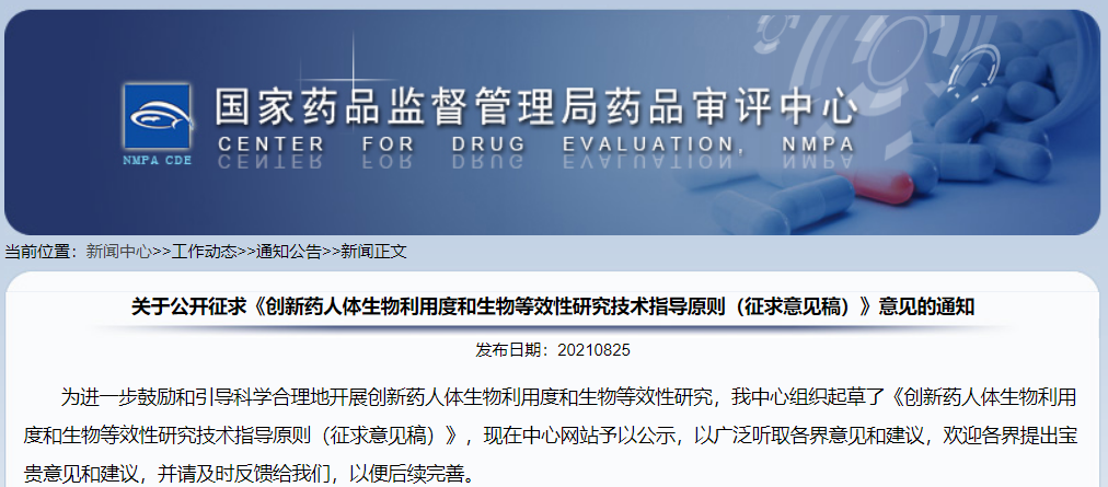 關(guān)于公開征求《創(chuàng)新藥人體生物利用度和生物等效性研究技術(shù)指導(dǎo)原則(征求意見(jiàn)稿)》意見(jiàn)的通知