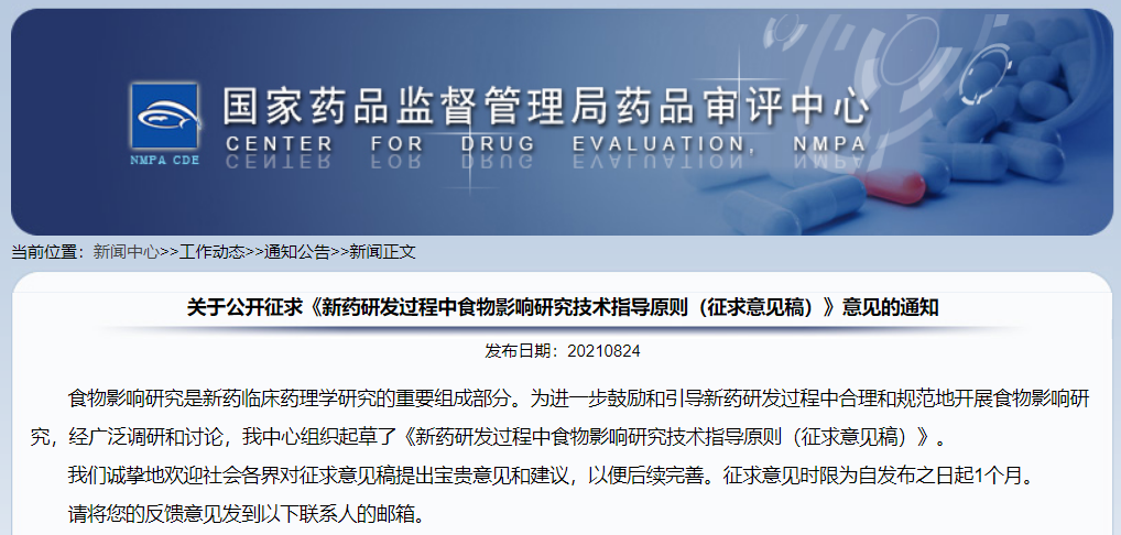 關(guān)于公開征求《新藥研發(fā)過(guò)程中食物影響研究技術(shù)指導(dǎo)原則(征求意見(jiàn)稿)》意見(jiàn)的通知