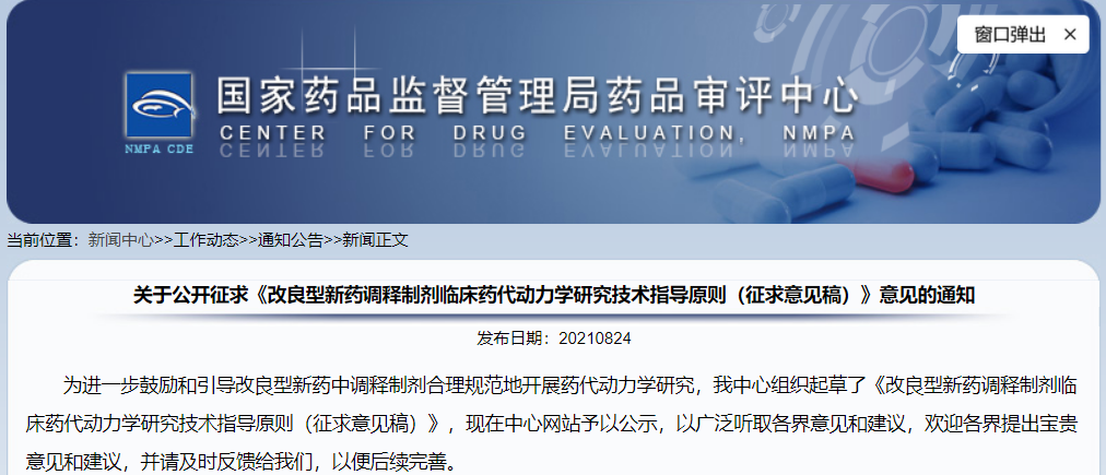 關(guān)于公開征求《改良型新藥調(diào)釋制劑臨床藥代動(dòng)力學(xué)研究技術(shù)指導(dǎo)原則(征求意見(jiàn)稿)》意見(jiàn)的通知