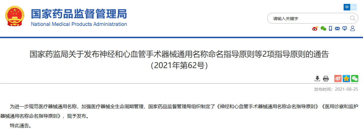關(guān)于發(fā)布神經(jīng)和心血管手術(shù)器械通用名稱命名指導(dǎo)原則等2項(xiàng)指導(dǎo)原則的通告(2021年第62號(hào))