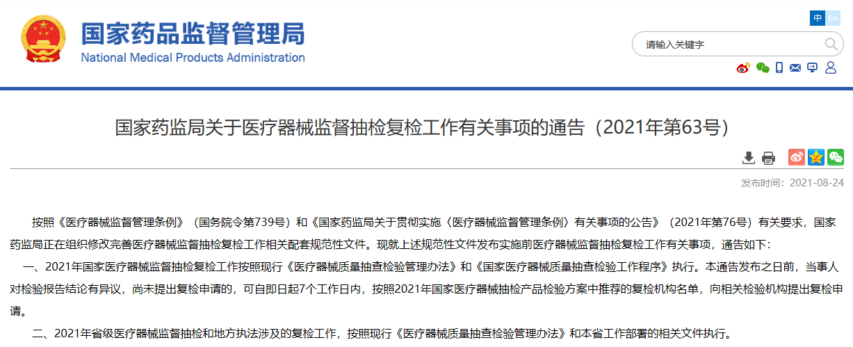 關(guān)于醫(yī)療器械監(jiān)督抽檢復(fù)檢工作有關(guān)事項(xiàng)的通告(2021年第63號(hào))
