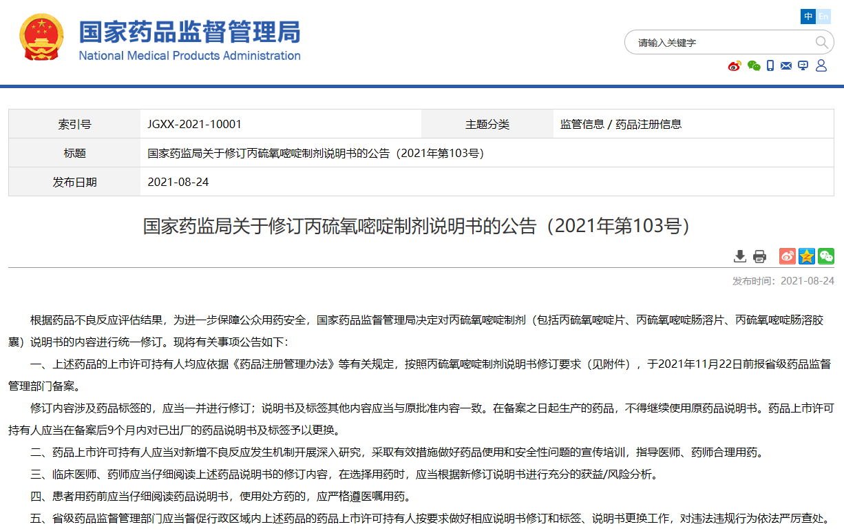 關(guān)于修訂丙硫氧嘧啶制劑說(shuō)明書的公告(2021年第103號(hào))
