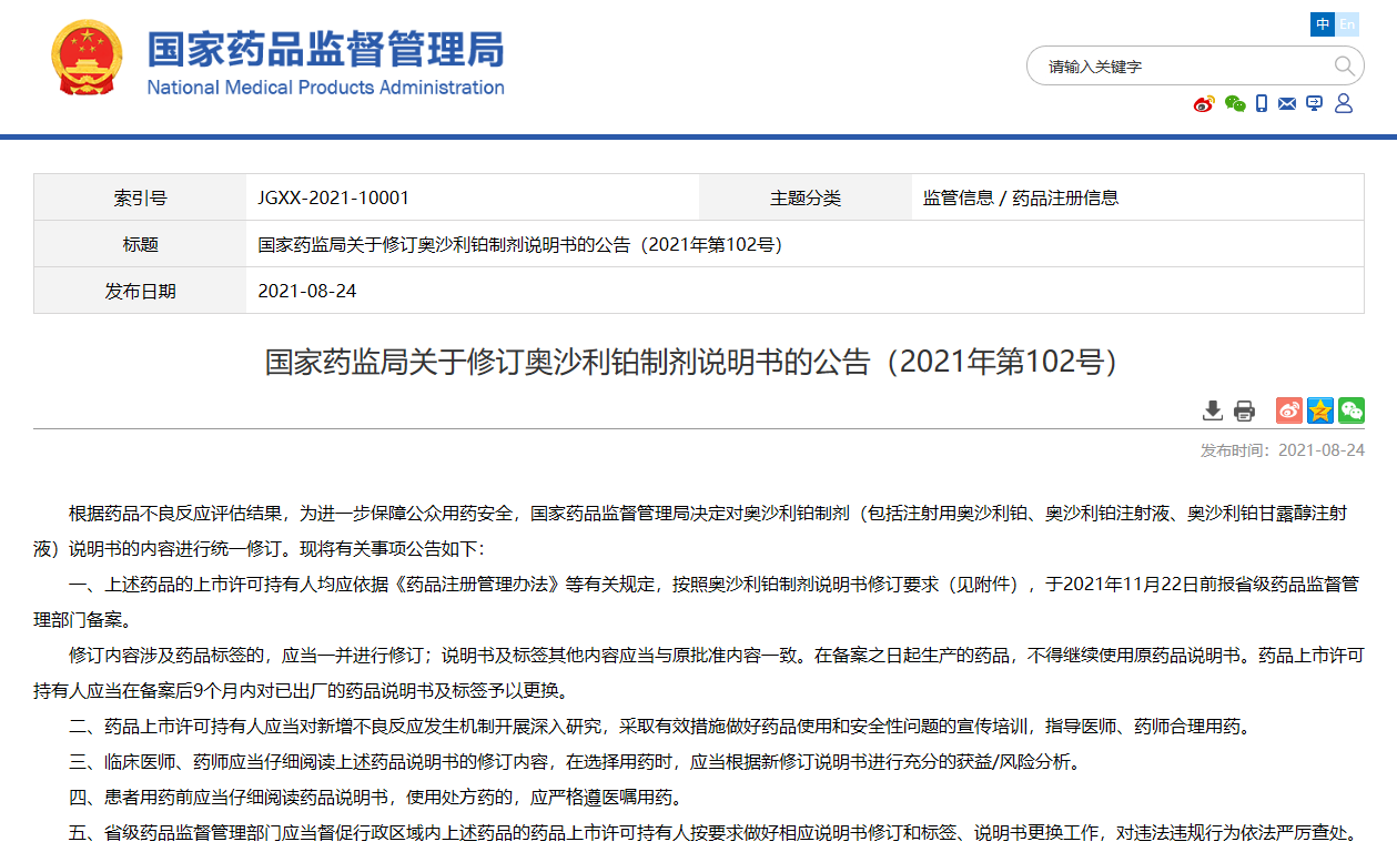 關(guān)于修訂奧沙利鉑制劑說(shuō)明書的公告(2021年第102號(hào))