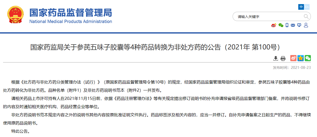 關(guān)于參芪五味子膠囊等4種藥品轉(zhuǎn)換為非處方藥的公告(2021年 第100號(hào))