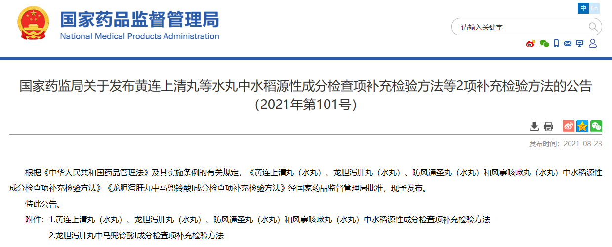 關(guān)于發(fā)布黃連上清丸等水丸中水稻源性成分檢查項(xiàng)補(bǔ)充檢驗(yàn)方法等2項(xiàng)補(bǔ)充檢驗(yàn)方法的公告(2021年第101號(hào))