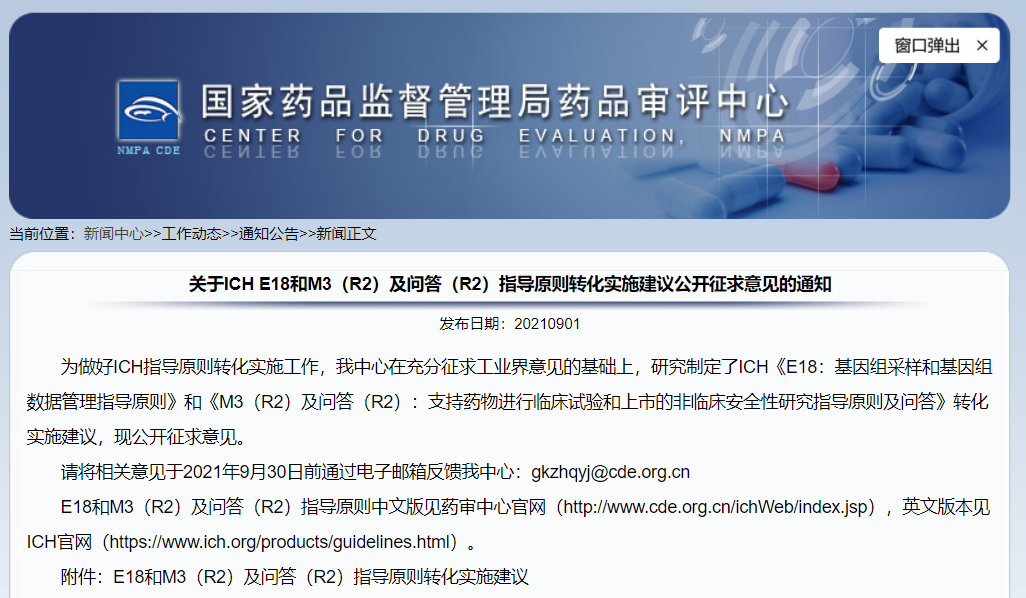關(guān)于ICH E18和M3(R2)及問(wèn)答(R2)指導(dǎo)原則轉(zhuǎn)化實(shí)施建議公開(kāi)征求意見(jiàn)的通知