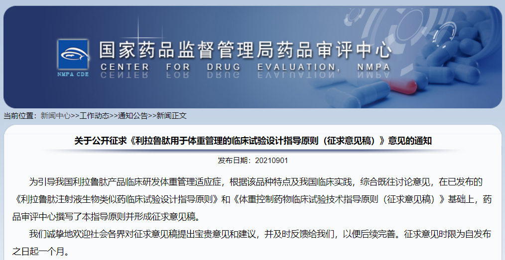 關(guān)于公開(kāi)征求《利拉魯肽用于體重管理的臨床試驗(yàn)設(shè)計(jì)指導(dǎo)原則(征求意見(jiàn)稿)》意見(jiàn)的通知