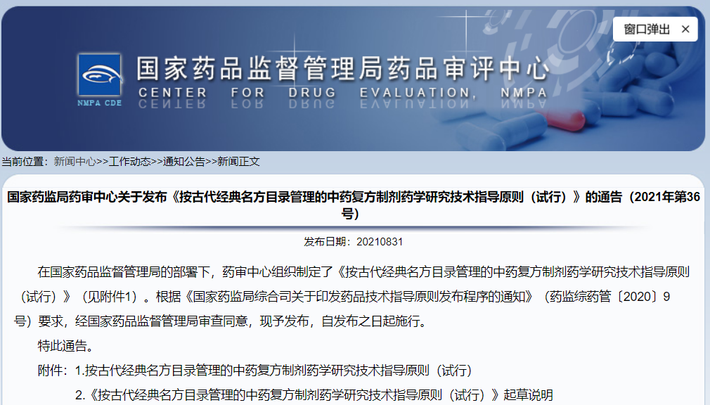 關(guān)于發(fā)布《按古代經(jīng)典名方目錄管理的中藥復(fù)方制劑藥學(xué)研究技術(shù)指導(dǎo)原則(試行)》的通告(2021年第36號(hào))