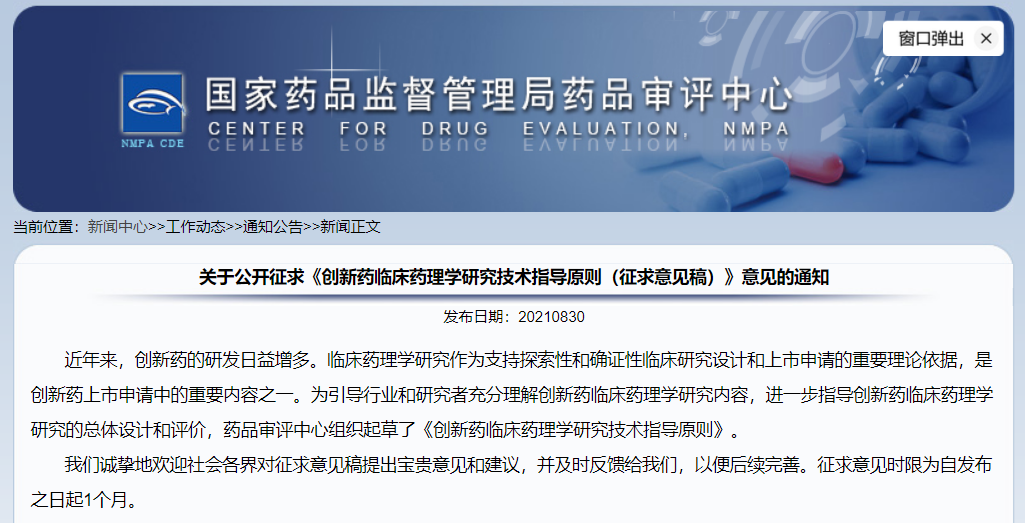 關(guān)于公開(kāi)征求《創(chuàng)新藥臨床藥理學(xué)研究技術(shù)指導(dǎo)原則(征求意見(jiàn)稿)》意見(jiàn)的通知