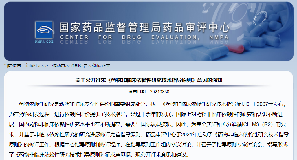 關(guān)于公開(kāi)征求《藥物非臨床依賴性研究技術(shù)指導(dǎo)原則》意見(jiàn)的通知