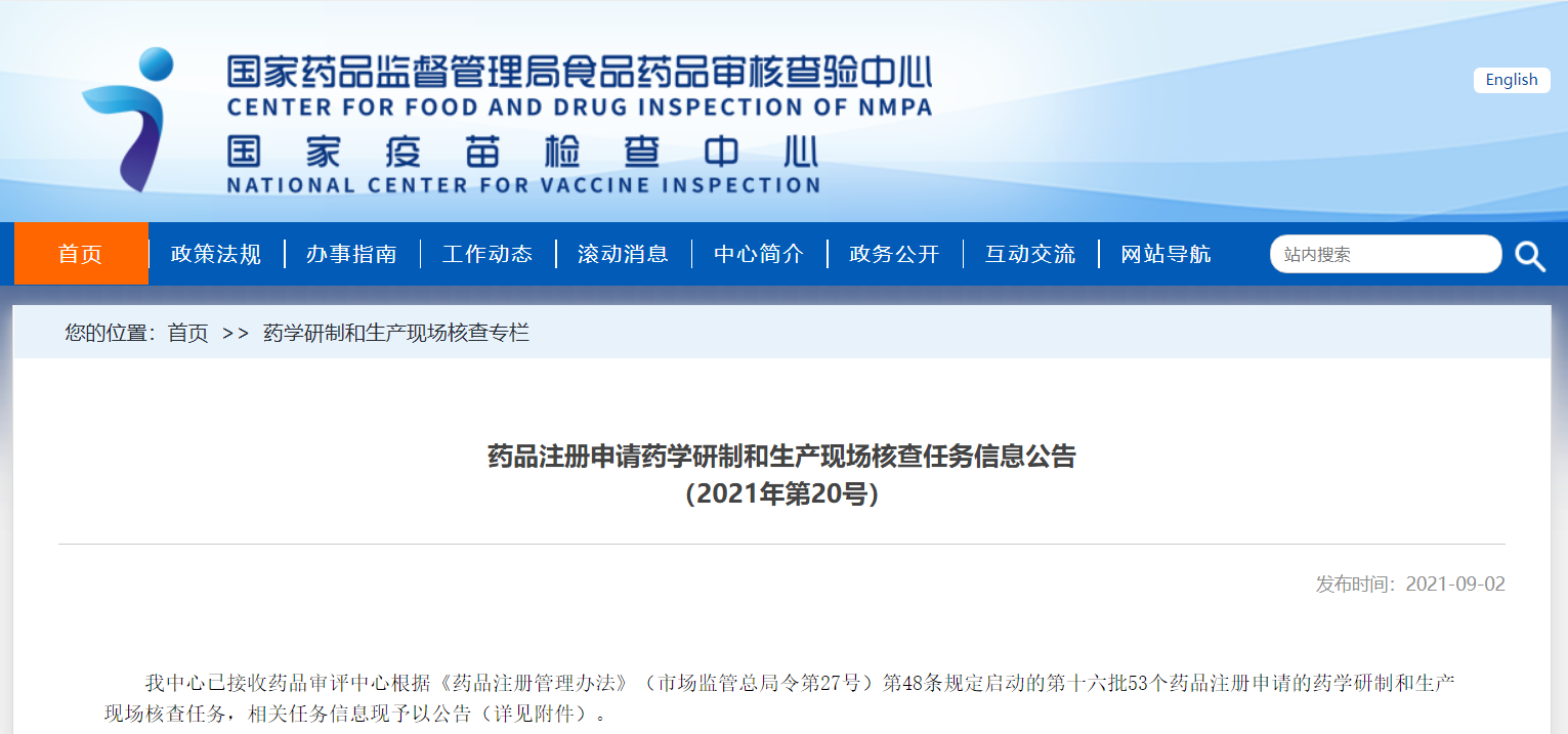 藥品注冊(cè)申請(qǐng)藥學(xué)研制和生產(chǎn)現(xiàn)場(chǎng)核查任務(wù)信息公告(2021年第20號(hào))