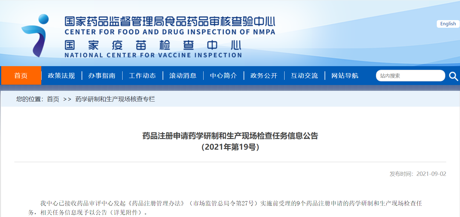 藥品注冊(cè)申請(qǐng)藥學(xué)研制和生產(chǎn)現(xiàn)場(chǎng)檢查任務(wù)信息公告(2021年第19號(hào))