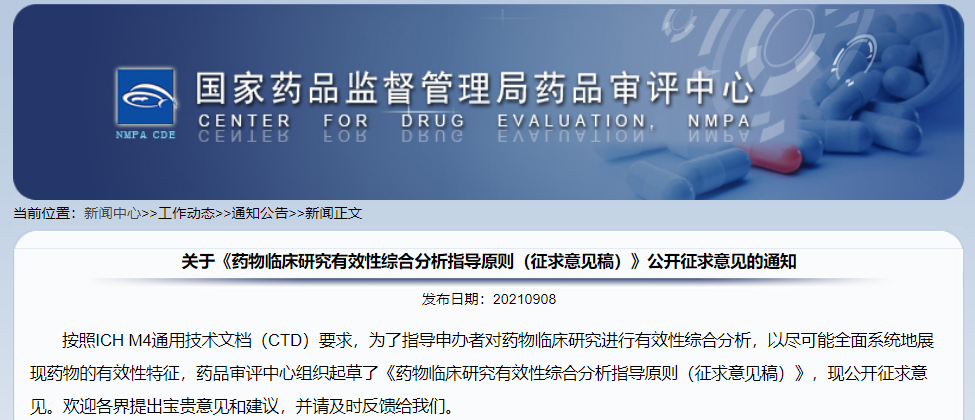 關于《藥物臨床研究有效性綜合分析指導原則(征求意見稿)》公開征求意見的通知