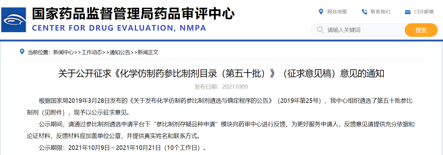 關(guān)于公開征求《化學(xué)仿制藥參比制劑目錄(第五十批)》(征求意見稿)意見的通知
