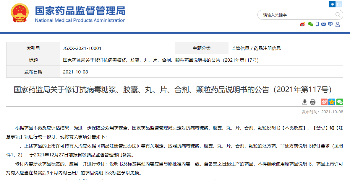 國家藥監(jiān)局關(guān)于修訂抗病毒糖漿、膠囊、丸、片、合劑、顆粒藥品說明書的公告(2021年第117號(hào))