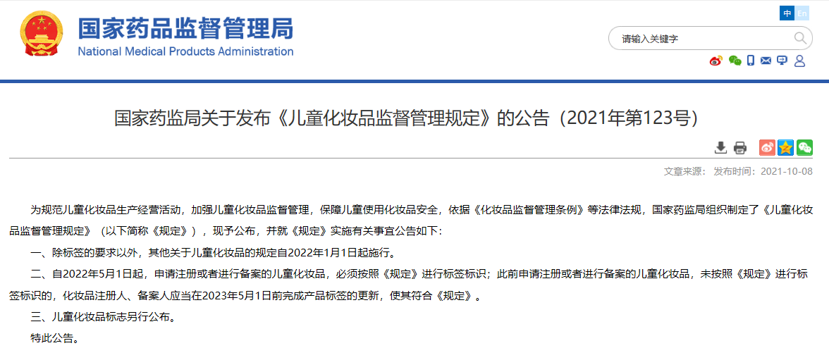 國家藥監(jiān)局關(guān)于發(fā)布《兒童化妝品監(jiān)督管理規(guī)定》的公告(2021年第123號(hào)